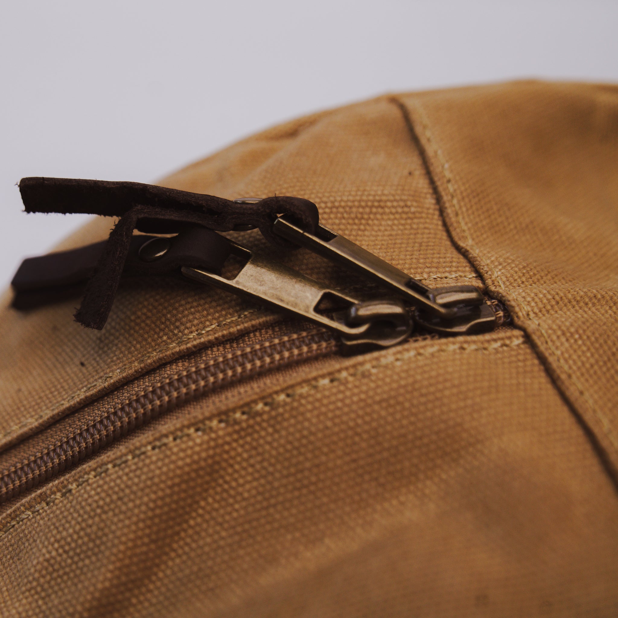 - Heavy duty brass zipper closure and zipper pull